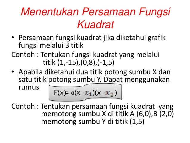 Persamaan garis y x1 dan y 2x 5persamaan garis yang melalui titik potong kedua garis tersebut dan sejajar garis 2y x 40 adalah. Menentukan fungsi kuadrat jika koordinat titik puncak grafik fungsi itu diketahui. Yang namanya grafik fungsi kuadrat adalah grafik dengan bentuk parabola seperti gunung atau lembah.